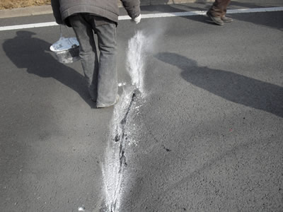 剛灌完的密封膠在其表面撒上干燥細沙,等密封膠充分冷卻,清掃完路面碎渣后,才能開放交通,一般冶卻時間為15分鐘左右,具體時間根據(jù)當(dāng)時氣溫靈活掌握。